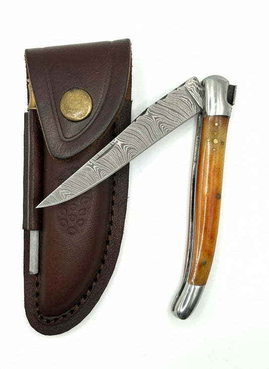 Edles Damast-Taschenmesser mit Griff aus Horn mit Lederscheide und Schärfer