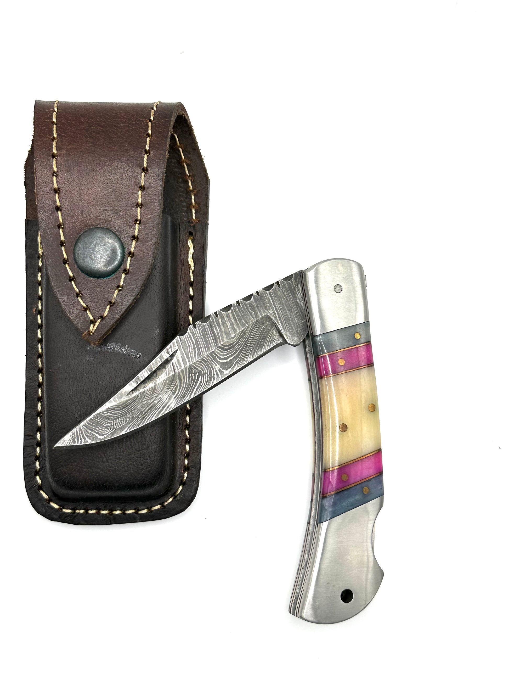 Die Gesamtlänge dieses 152 Gramm schweren Klappmessers liegt bei 20 Zentimetern. Sie erhalten dieses Damast-Messer in einer dunkelbraunen Lederscheide.